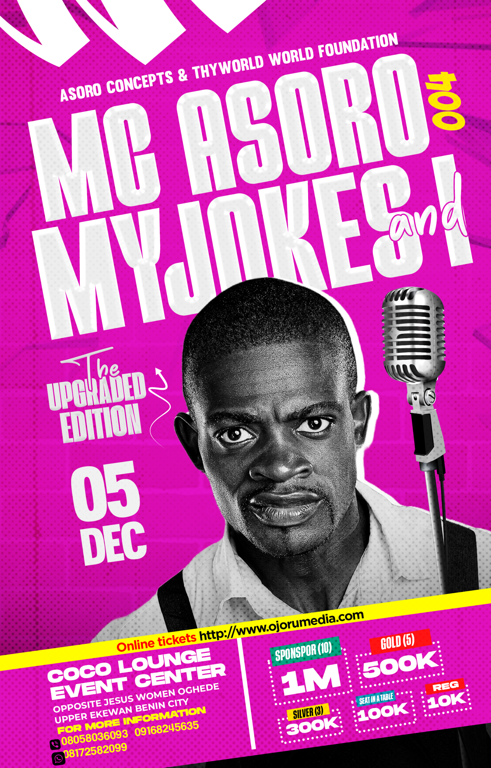 It’s that time of the year for laughter, culture, and unforgettable entertainment! Asoro Concepts & Thyworld World Foundation proudly presents the MC Asoro My Jokes and I (004) – The Upgraded Edition. Join us for a celebration that brings together humor, traditional flair, and a grand stage performance like no other.